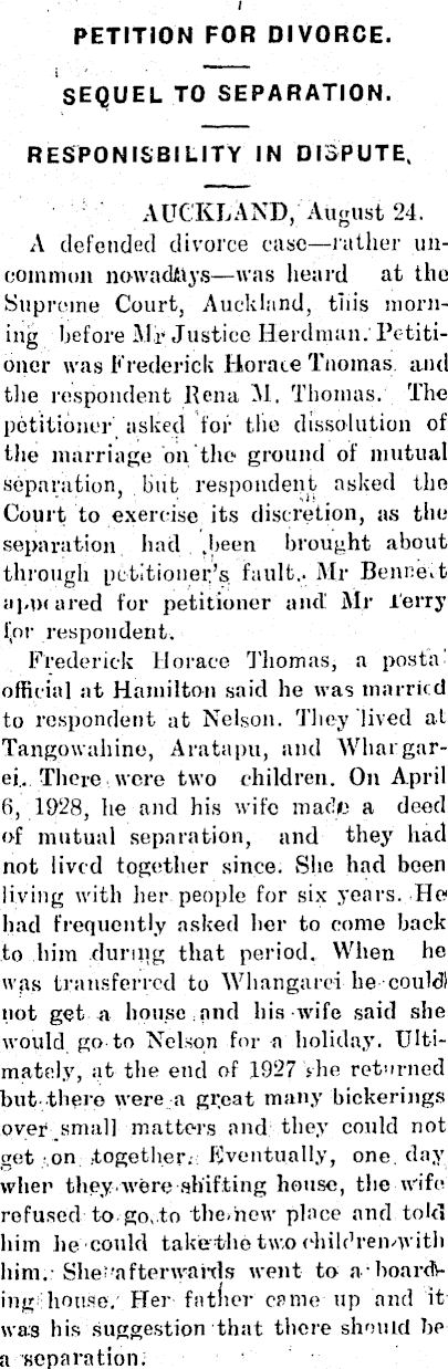 / PETITION FOR DIVORCE. SEQUEL TO SEPARATION. RESPONISBILITY IN DISPUTE, AUCKLAND, August 24. A defended divorce case —rather uncommon nowadays—was heard at the Supreme Court, Auckland, this morning before Mi- Justice Herdman. Petitioner was Frederick Horace Tnomas and the respondent Rena M. Thomas. The petitioner asked for the dissolution of the marriage on the ground of mutual separation, but respondent asked the Court to exercise its discretion, as the separation had .been brought about through petitioner’s fault.. Mr Benue, t apuiared for petitioner and Mi - terry lor respondent. Frederick Horace Thomas, a postal official at Hamilton said lie was married to respondent at Nelson. They lived at Tangowahine, Aratapu, and Whargarei.. There were two children. On April 6, 1928, lie and his wife niacin a deed of mutual separation, and they had not lived together since. She had been living with her people for six years. He had frequently asked her to come back to him during that period. When he was transferred to Whangarei he could! not get a bouse and bis wife said she would go to Nelson for a holiday. Ultimately, at the end of 1927 she returned but there were a great many bickerings over small matters and they could not get on together. Eventually, one day when they.were shifting house, the wife refused to go,to the.new place and told him lie could takethe two ohildremwith him. She-'afterwaitls went to a boardving house. Her father came up and it was bis suggestion that there should be a separation.