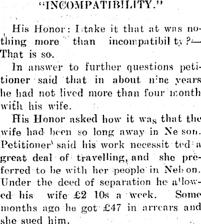 “INCOMPATIBILITY.” His Honor: I take it that at was nothing more than iucompatibil ty ? That is so.. In answer to further questions petitioner said that in about n : ne years he had not lived more than four month with his wife. His Honor asked how it wa s that the wife had- been so long away in Ne son. Petitioner'said his work necessit ted a great deal of travelling, and she preferred to be with her people in Neb on. Under the deed of separation he- a'lowed bis wife £2 10s a week. Some months ago be got £47 in arrears and she sued him.