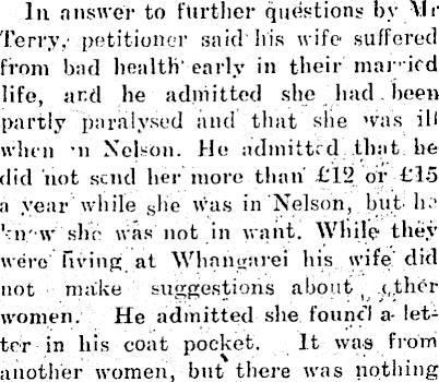 In answer to further questions by Mr Terry, petitioner said his wife suffered from bad health’ early in their marriedlife, and he admitted she had been partly paralysed and that she was ill when mi Nelson. He admitted that be did not send her more than £l2 or £ls a year while s lie was in Nelson, but lm 'ar-w she was not in want. While they were living at Whangarei his wife did not make suggestions about t other women. He admitted she found a- letter in his coat pocket. It was from another women, but there was nothing