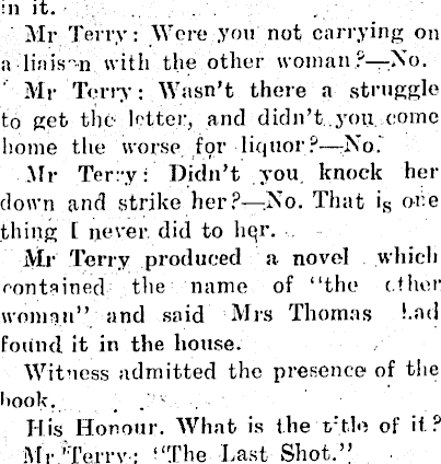 in it. Mr Terry: Were you not carrying on a liais'-n with the other woman.?—No. ■' Mi- Terry: Wasn’t there a struggle to get the- letter, arid didn’t .you. come home the worse for liquor?—-No. Mr Terry: Didn’t you knock her down and strike her?—.No. That is one thing 1 never did to hqr. Mr Terry produced a novel which contained the name of “the ether woman” and said Mrs Thomas had found it in the house. Witness admitted the presence of the book. His Honour. What is ihe r/’tle of it? Mr.’Terry : “The Last Shot.”