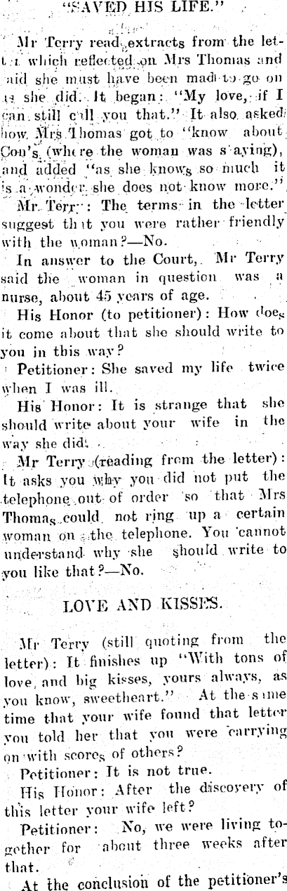 “.SAVED HIS LIFE.” Air Terry read.,extracts from the lett i which reflected;,on Mrs Thomas and aid she must have been madi to go on is she did. It began: “My love, if I can still c >ll you that.” It also asked: !iow, Airs Thomas got to “know about Con’s, (where the woman was s aying), and added “as she knowg so much it is a--wonder, she does not know more.”, Mr. Terr : The terms in the-letter suggest th it you were rather friendly with the woman? —No. In answer to the Court, Mr Terry said the woman in question was a nurse, about 45 years of age. His Honor (to petitioner): How doe s it come about that she should write to you in this wav? Petitioner: She saved my life twice when I was ill. His Honor: It is strange that she should write about your wife in the way she did:. . Mr Terry (reading from the letter): It asks you why you did not put the telephone out of order so that Mrs Thoma s could not l in S «P « certain woman on , the telephone. You cannot understand why she should write to you like that ?—No. LOVE AND KISSES. Mr Terry (still quoting from the letter): It finishes up “With tons of love, and big kisses, yours always, as you know, sweetheart.” At the smie time that your wife found that letter you told her that you were carrying on with score s of others? Petitioner: Tt is not true. His Honor: After the discovery of this letter your wife left? Petitioner: No, we were living together for about three weeks after that. At the conclusion of the petitioner s