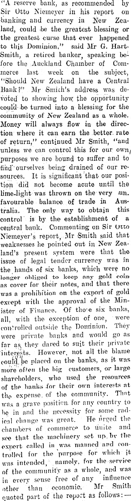 •‘A reserve bank, as recommended by Sir Otto Niemeyer in his report on banking and currency in New Zealand, could be the greatest blessing or the greatest curse that ever happened to tips Dominion,” said Mr G. HartSmith, a retired banker, speaking before the Auckland Chamber of Commerce last week on the subject, “Should New Zealand have a Central Bank?” Mr Smich’s address was devoted to showing how: the opportunity could be turned into a blessing for the community of New Zealand as a whole. Money will always flow in the direction where it can earn the better rate of return,” continued Mr Smith, “and unless we can control this for our own ( purposes we are bound to suffer and to find''ourselves being drained of our resources. It is significant that our position did not become acute until the lime-light was thrown on the very am. favourable balance of trade in Australia. The only way to obtain this control is by the establishment of a central bank. Commenting on Sir Otto Niemeyer’s report, Mr Smith said that weaknesses he pointed out in New Zealand’s present system were that the issue of legal tender currency was in the hands of six banks, which were no longer obliged to keep any gold coin as cover for their notes, and that there was a prohibition on the export of gold except with the approval of the Minister of Finance. Of tho-e six banks, all, with exception of one, were controlled outside the Dominion. They were private banks and would go as far as, they dared to suit their private interests. However, not all the blame <•oulcj.be placed on the banks, as it was more often the big customers, or large shareholders, who used the resources of the banks .for their own interests at the expense, of the community. That was a grave position, for any country to Ik> in and the necessity for some radical change was great. He urged the chambers of commerce to unite and see that the machinery set- up. bv the export called in was manned and controlled for the purpose for which it was intended, namely, for the service of the community as a whole, and was in every sense free of any influence other than economic. Mr Smith quoted part of the report as follows: