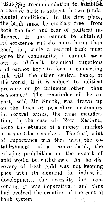 “But 'the recommendation to .tettiblisli a reserve bank is subject to two fundamental conditions. In the first place, the bank must be entirely free from both the fact and fear of political influence. If that cannot be obtained its existence will do more harm than good, for, while a central bank must serve the community, it cannot carry out its difficult technical functions and cannot hope to form a connecting link with the other central banks or the world, if it is subject to political pressure or to influence other than economic.” The remainder of the report, said Mr Smith,, was drawn up on the lines of procedure customary for central banks, the chief modification, in the case of New Zealand, being the absence of a money market or a short-loan market. The final point of importance was that with the establishment of a reserve bank, the existing prohibition on the export of gold would be withdrawn. As the discovery of fresh gold was not keeping pace with its demand for industrial development, the necessity for conserving it was imperative, and thus bad evolved the creation of the central bank system.