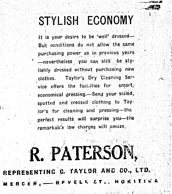 sjUomJM STYLISH ECONOMY i , ■ * -r ■ ' ■ V;.; It is your desire to be ‘well’ dressed — But ocnditions do not allow the same purchasing power as in previous years —nevertheless you can still be stylishly dressed without purchasing new clothes. Taylor’s Dry Cleaning Service offers the faci.ities for economical dressing.—Send your soiled, spotted and creased clothing to Taylors for cleaning and pressing—the perfect results will surprise you—the remarkable low charges will amaze. REPRESENTING C. TAYLOR AND CO,, LTD. M ER C e B c BI s V E L L fiT,. H O K I T I W A