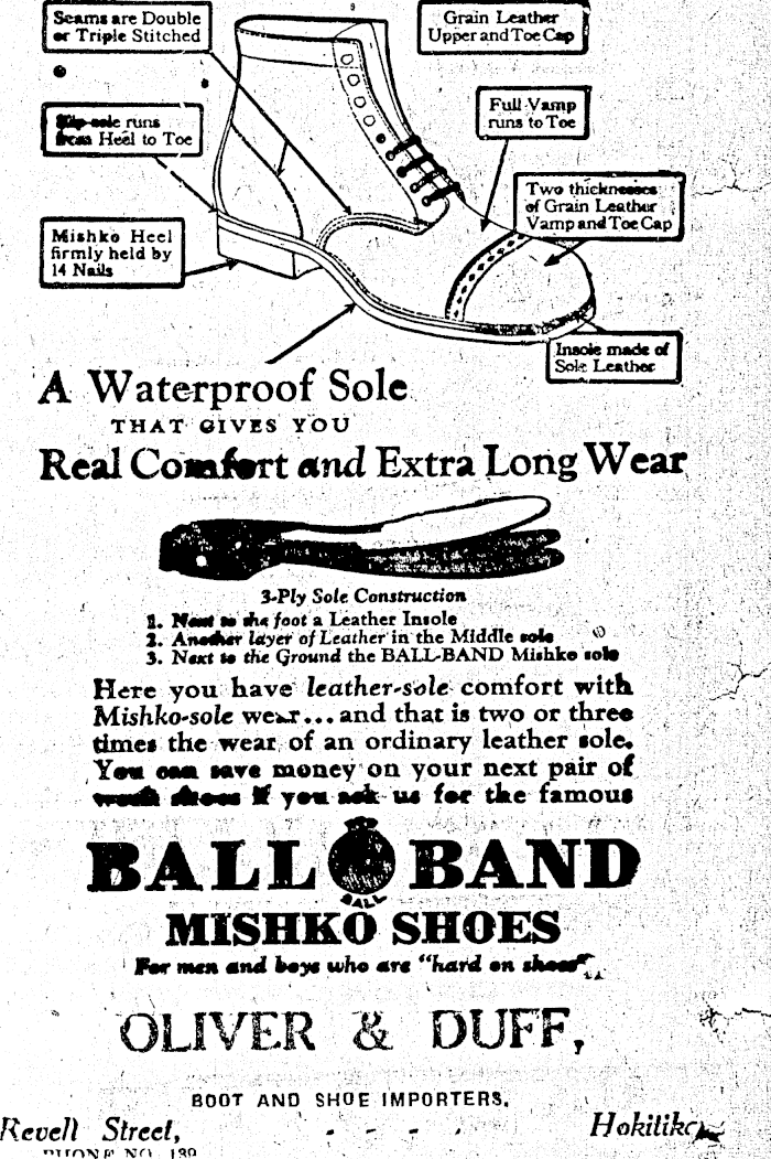Seams are Double •r Triple Stitched Grain Leather Upper and Toe Cap \S Full Vamp runs to Toe I IMp aair [mb He oie runs Heel to Toe Mishkb Heel firmly held by 14 Nails A Waterproof Sole THAT GIVES YOU Real Comfort And Extra Long Wear 3-Ply Sole Construction S. Man* •• the foot a Leather Insole 1. An otm layer of Leather in the Middle walm v 0 3. N ext h die Qround the BALL-BAND Mishke sell Here you have leather-sole comfort with M ishko-sole we*x.«* and that is twp or three times the wear of an ordinary leather sole, Ytt om save money on your next pair of If yom mAmm for the famous BALL# BAND MISHKO SHOES 1 Wm ims mnd hoys who mro ‘‘hard on OLIVER & DUFF, BOOT AND SHOE IMPORTERS. Revell Street, "T rr*M P' \IC\ |3O Hokitikcj^