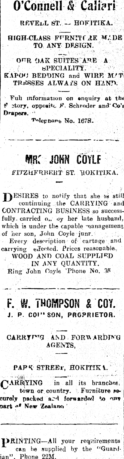 O’Connell & Caifrri RjRVEj.iL ST.— HOKITIKA. '> HIGH-CLASS FDRNITfRE MADE TO ANY DESIGN. Orrß OAK SUITES ARE A speciality: KAPOO BEDDING and WIRE M/T TRESSES ALWAYS ON HAND. Full information on enquiry at th« F Dtory, opposite E. Schroder and' Oo’i Drapers. '•Mepdan* No. 1675. MR; JOHN COYLE FITZHERBERT ST. HOKITIKA. TYESTRES to notify that she is still continuing the CARRYING and CONTRACTING BUSINESS so successfully. carried oy her late husband, which is under the capable -uanagement of her son, John Coyle junr. Every description of cartage and carrying ejected. Prices reasonable, j WOOD AND COAL SUPPLIED IN ANY QUANTITY. Ring John Coyle ’Phone No. 95 1 F. W. THOMPSON & COY. J. P. COI ’* SON, PROPRIETOR. CARRYING AND FORWARDING AGENTS, PAP K STREEi , HOKITIK A. j -'•ist in all its branches, town or country. Furniture ?©• curely packed ard forwarded to any oart New Zealand |>RINTING— All your requirements can he supplied by the “Guardian”. Phone 22M.