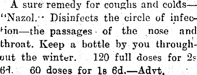 A sure remedy for coughs and colds—“Nazol. - Disinfects the circle of infection—tHe passages of the nose and throat. Keep a bottle by you through-, out the winter. 120 full doses for 2s 6d. 60 doses for 1b 6d.—Advt,
