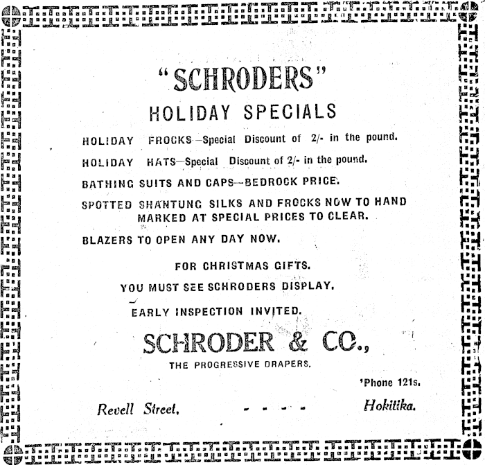 rr: rn rr: rr: rr: r wlh: iu rx: -x xx: HH HH KH HH HH HH , HH HH HH HH HH HH HH HH HH HH HH HH HH TT.tr.T i a ■ i«dna d p i. u : m rr: rr: rr. rr: rr: xm XXV HH “SCiRODERS” HOLIDAY SPECIALS HOLS DAY FROCKS -Special Discount of 2/- in the pound. HOLIDAY HATS—Special Discount of 2/- in the pound. BATHING SUITS AND CAPS-BEDROCK PRICE. SPOTTED SHANTUNG SILKS AND FROCKS NOW TO HAND MARKED AT SPECIAL PRICES TO CLEAR. BLAZERS TO OPEN ANY DAY NOW. FOR CHRISTMAS GIFTS. YOU MUST SEE SCHRODERS DISPLAY. EARLY INSPECTION INVfTED. SCHRODER & CO., THE PROGRESSIVE DRAPERS. Recell Street , ’Phone 121 s. Hokitika. HH HH yy «■■ > HH HH HH HH HH HH HH HH HH HH Hif a HH HH