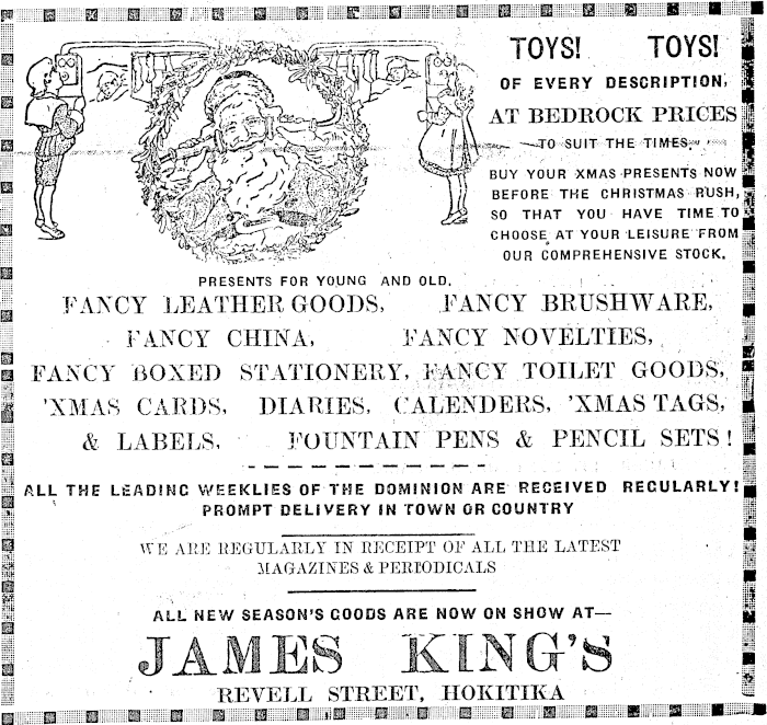 m 0 ‘II , Q U B.U E B Jilß'lA ES i’. • E 9 ''-'M ■: S’!: !• B .■ .£*■ : TOYS! TOYS! Y7>n 1; OF EVERY DESCRIPTION, wJ AT BEDROCK PRICES “—TO SUIT THE Tl NHSS;» / ! f BUY YOUR XMAS PRESENTS NOW BEFORE THE CHRISTMAS RUSH, SO THAT YOU HAVE TIME CHOOSE. AT YOUR LEISURE FROM OUR COMPREHENSIVE STOCK. PRESENTS FOR YOUNG AND OLD. jgg FANCY LEATHER GOODS, FANCY BRUSHWARE, | • FANCY CHINA, FANCY NOVELTIES, | FANCY BOXED STATIONERY, FANCY TOILET GOODS, I 'XMAS CARDS, DIARIES, CALENDERS, ’XMAS TAGS, 1 & LABELS, FOUNTAIN PENS & PENCIL SETS ! t & 00 u •v —: sz. o> m 3 m •m mm <ss&* ■trss*? ,\£~v Hi ALL THE LEADING WEEKLIES OF THE DOMINION ARE RECEIVED REGULARLY! |j i M ' i'iii PROMPT DELIVERY IN TOWN OR COUNTRY WE ARE REGULARLY IN RECEIPT OF ALL THE LATEST MAG AZINES & PERIODICALS ALL NEW SEASON’S GOODS ARE NOW ON SHOW AT—JAMES KING’S REVELL STREET, HOKITIKA Eli !.. ..0 J: □ i.m -P i:B; mm if 1 ii •m I. 1 '1
