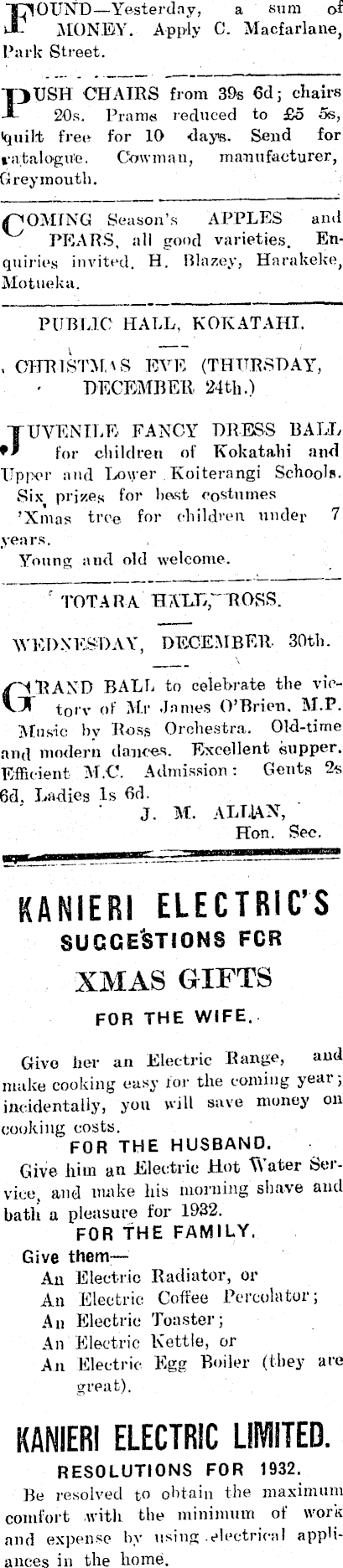 J7TOUND —Yesterday, a sum of dt- MONEY. Apply C. Macfarlane, Park Street. T3XISH CHAIRS from 39s 6d; chairs A 20s. Prams reduced to £5 ss, 'quilt free for 10 days. Send for ratal ogu'e. Cowman, manufacturer, Grey mouth. (OOMJNG Season’s APPLES and PEARS, all good varieties. Enquiries invited. H. Blazey, Harakeke, Motuek a. PUBLIC HALL, KOKATAHI. , CUR 1 STM,a S EVE (THURSDAY, DECEMBER 24th.) JUVENILE FANCY DRESS BALL for children of Kokatahi and Upper and Lower Koiterangi Schools. Six prizes for hast costumes ’Xmas tree for children under 7 years. Young and old welcome. TOTARA HALL,'ROSS. WEDNESDAY, DECEMBER 30th. GRAND BALL to celebrate the victory of Mr James O’Brien. M.P. Music by Ross Orchestra. Old-time and modern dances. Excellent <supper. Efficient M.C. Admission: Gents 2s 6d. Ladies Is 6d. J. M. ALLAN, Hon. Sec. KANIERI ELECTRIC’S SUGGESTIONS FOR XMAS GIFTS for the wife. Give her an Electric Range, and make cooking easy for the coining year; incidentally, you will save money on cooking costs. FOR THE HUSBAND, Give him an Electric Hot V\ ater Seivice, and make his morning shave and batli a pleasure for 1932. FOR fHE FAMILY. Give them— An Electric Radiator, or An Electric Coffee Percolator; An Electric Toaster; An Electric Kettle, or An Electric Egg Boiler (they are great). KANIERI ELECTRIC LIMITED. RESOLUTIONS FOR 1932. Be resolved to obtain the maximum comfort with the minimum of work and expense by using .electrical appliances in the home.