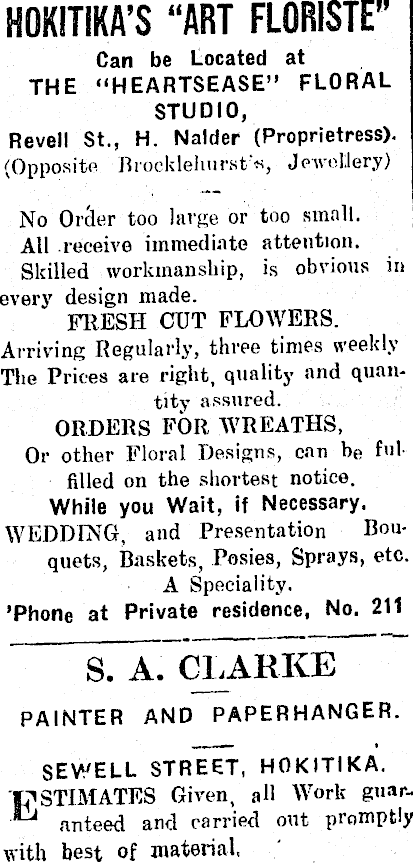 HOKITIKA’S “ART FLORISTE" Can be Located at THE “HEARTSEASE” FLORAL STUDIO, Revell St., H. Nalder (Proprietress). (Opposite Brocklehurst«, Jewellery) No Orcler too large or too small. All receive immediate attention. Skilled workmanship, is obvious in every design made. FRESH CUT FLOWERS. Arriving Regularly, three times weekly The Prices are right, quality and quantity assured. ORDERS FOR WREATHS, Or other Floral Designs, can be fulfilled on the shortest notice. While you Wait, if Necessary. WEDDING, and Presentation Bouquets, Baskets, Posies, Sprays, etc. A Speciality. ’Phone at Private residence, No. 211 S. A. CLARKE PAINTER AND PAPERHANGER. SEWELL STREET, HOKITIKA. ESTIMATES Given, all Work guaranteed and carried out promptly with best of material