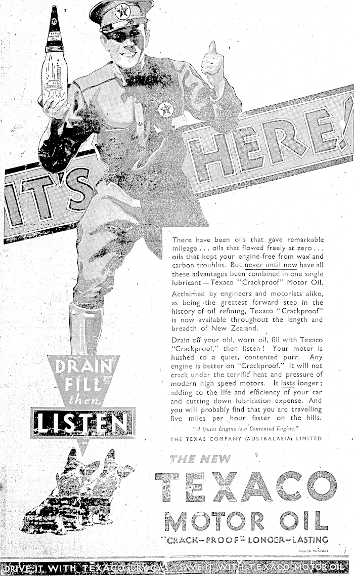 There have been oils that gave remarkable mileage ... oils that flowed freely at zero . . . oils that kept your engine Tree from wax and carbon troubles. But never until now have all these advantages been combined in one single lubricant Texaco “Crackproof” Motor Oil. Acclaimed by engineers and motorists alike, as being 'the greatest forward step in the history of oil refining, Texaco “Crackproof” is now available throughout the length and breadth of New Zealand. Drain off your old, worn oil, fill with Texaco “Crackproof,” then listen ! Your motor is hushed to a quiet, contented purr. Any engine is better on “Crackproof.” It will not crack under the terrific heat and pressure of modern high speed motors. It lasts longer; adding to the life and efficiency of your car and cutting down lubrication expense. And you will probably find that you are travelling five miles per hour faster on the hills. i . “A. Quiet Engine is a Contented Engine THE TEXAS COMPANY (AUSTRALASIA) LIMITED g 4R& •» iv OIL CRACK- PRO© F - LONGER-LASTING Copyright MO7-90-32