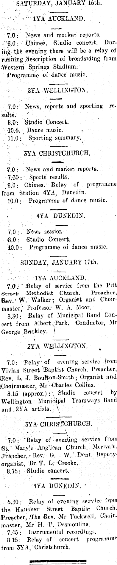 SATURDAY, JANUARY 16th. IYA AUCKLAND. 7.0,: News and market reports. 8.0; Chimes. Studio concert. During the evening there twill be a relay of running .description of broad si ding from Western Springs Stadium. •Programme of dance music. 2YA WELLINGTON. 7.0: News, reports and sporting results. 8.0: Studio Concert. ■10.6. Dance music. 11.0: Sporting summary. SYA CHRISTCHURCH. 7.0: News and market reports. 7;30: Sports results. '8.0: Chimes. Relay of programme from 'Station 4YA, Dunedin. 10.0 : Programme of dance music. 4YA DUNEDIN. 7.0: News session ■8.0: Studio Concert. 10.0: Programme of dance music. SUNDAY, JANUARY 17th. . IYA AUCKLAND. 7.0; * Relay of service from the Pitt ■Street? Methodist Church. Preacher, 'Rev. ’ W. Walker ;, Organist and Choirmaster, Professor W. A. Moor. 8.30: Relay of Municipal Band Concert from Albert-Park. Conductor, Mr George Bnckley. j 2YA WELLINGTON. 7.0: Relay of evening service from Vivian 'Street Baptist Church. Preacher, Rev. L. J. Boufton-Smith; Organist and Choirmaster, Mr Charles Collins. B.IS (approx.) : . Studio concert by Wellington Municipal Tramways Band and 2YA artists. \ 3YA CHRISTCHURCH. 7.0: Relay of eventing .service from iSt. Mary’s Ang'kan Church, Merivale. Preacher, Rev. C. W. Dent. Deputyorganist, Dr T. L. Crooke, 8.15: Studio concert. 4YA DUNEDIN. ' 6.30 : Relay of evening service from the Hanover Street Baptist Church. (Preacher, /The Rev. Mr Tuck well. Choirmaster, Mr H. P. Desmoulins. 7.45: Instrumental recordings. 8.1'5: Relay of concert programme from 3YA, Christchurch.