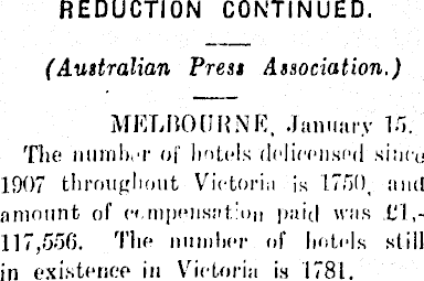 REDUCTION CONTINUED. (Australian Press Association.) MELBOURNE, January 1/5. The mwilvr of hotels dclieenscd since 1907 throughout Victoria is 17/30, and amount of compensation paid was £l,117,5/56. The nunil)(*r of hotels still in existence in Victoria is 1781.