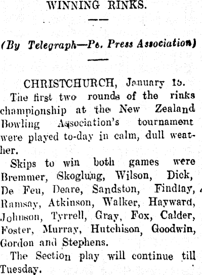 WINNING RINKS. (By Telegraph — Pt. Press Association) CHRISTCHURCH, January 10. Tiie first two rounds of the rinks championship at the New Zealand Bowling Association’s tournament were played to-day in calm, dull weather. Skips to win both games were Bremmer, iSkoglujng, Wilson, Dick, De Feu, Deare, Sandston, Findlay, * Ramsay, Atkinson, Walker, Hayward, Johnson, Tyrrell, Gray, Fox, Calder, Foster, Murray, Hutchison, Goodwin, Gordon and Stephens. The Section play will continue till Tuesday.