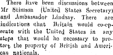 There luv-fe been discussions between Mi' BtinisiJh (United States Secretary) atid Ambassador Lindsay. There are indications ithnt Britain would co-op-erate with the United States in any steps that would bo necessary to protect the property of British and American nationals.