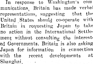 In response to Washington's com munications, Britain lias made verbal representations, suggesting that the United States should co-operate with Britain in requesting Japan t.o take no action in the International Settlement without consulting the interested Governments. Britain is also asking Japan for information in connection with the recent developments at Shanghai.