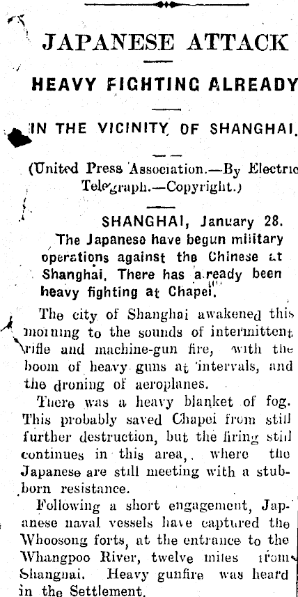 JAPANESE ATTACK HEAVY FIGHTING ALREADY THE VICINITY, OF SHANGHAI. (United Press Association.—By Electric Telegraph.—Copyright.) ‘ SHANGHAI, January 28. The Japaneso have begun military operations against the Chinese at Shanghai. There has a.ready been heavy fighting at Chapei. , The city of Shanghai awakened this morning to the sounds of intermittent "Vide and machine-gun fire, with the boom of heavy guns at intervals, and the droning of aeroplanes. Tnere was a heavy blanket of fog. This probably saved Chapei from still further destruction, but the firing still continues in this area, where the Japanese are still meeting with a stubborn resistance. Following a short engagement, Japanese naval vessels have captured tlie Whoosong forts, at the entrance to the Wlmngpoo River, twelve miles il'onm Shangnai. Heavy gunfire was heard in the Settlement.