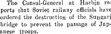 The Consul-General at Harbin reports that Soviet railway officials have ordered the destruction of the Sungari bridge to prevent the passage of Japanese troops.