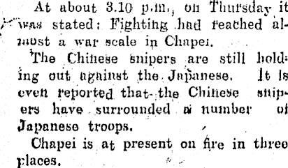 At about 3.10 p-lil,, on Thursday it /'•' was statedi Fighting had readied almost a war scale ip Chapei. The Chinese snipers are still hold l ing out against the , Japanese. It Is even reported that-Jhe Chinese snipers have surrounded a number of Japanese troops. Chapei is at present on fire in three places.