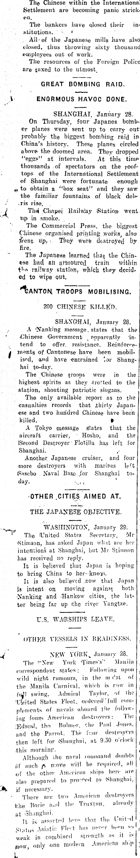 Tile Chinese within the International Settlement are becoming jranic stricken. The bankers have closed their institutions. > All of the Japanese mills have also dosed, thus throwing sixty thousand employees out of work. Tile resources of the Foreign Police are taxed to the utmost. GREAT BOMBING RAID. V ENORMOUS HAVOC DONE. SHANGHAI. January 28. On Thursday, four Japanes bomber planes were sent up to carry out probably the biggest bombing raid in China’s history. Thes e planes circled above the doomed area. They dropped “eggs” at intervals. At this time thousands of spectators on the rooftops of the International Settlement of Shanghai were fortunate enough « to obtain a “box seat” and they saw the familiar fountains of black debris rise. I Tlui Cliapei Rnihda.y ‘Station went up in smoke. The Commercial Press, the biggest Chinese organised printing works, also /rent up, They wei'e destroyed by fire. The Japanese learned that the Chinese had an armoured train within tbn railway station, which they decided to wipe gut, Canton, troops mobilising. 200 CHINESE KILLED. SHANGHAI, January 28. A 'Nanking message.. states that the ' Chinese 'Government apparently 'intend to offer, resistance. Reinfoiv-p----j ments of Cantonese have been mobilised, and have entrained lor Shanghai to-day. The 'Chinese -troops were in the J highest 'Spirits as they •trotted to the station, shouting patriotic slogans. The only available report as to the casualties records that .thirty Japanese and two hundred Chinese have been killed. * A Tokyo message states that the : aircraft carrier, Hosho, and the ISecond Destroyer Flotilla has left for Shanghai. Another Japanese cruiser, and four more destroyers with marines left iSascbo Naval Base for Shanghai today. •OTHER CITIES AIMED AT. THE JAPANESE OBJECTIVE. .. WASHINGTON, January 29. The United States Secretary. Mr 'Stimson, has asked Japan what are her intentions at Shanghai, but Mr Stimson has received no reply. It is believed that Japan is hoping to bring China to he-r-kneo(>. It is also believed now that Japan is intent on moving against both •Nanking and Hankow cities, the latter being far up ithe river Yangtze. U.S. WARSHIPS LEAVE. * OTHER VESSELS IX READINESS. NEW YORK,. January 28. The '"New York Himes's'’ Manila correspondent states : Following upon wild night rumours, in the in r'st of the Manila Carnival, which is row in fvJl swing. Admiral Taylor, o! the 'L’Onted States Fleet, ordered''full complements of n avals aboard the following fours American destroyers: Ihe ,'KdscHil, the Buhner, ':hc Haul Jones, and the Parrot. The four destroyers then left for 'Shanghai, at 9.30 o'clock this morning. Although ihe naval command doubts jif isuch move will be mpiired, all of the other American ships here are also prepared to proved (o 'Shanghai, A if necessary. There are two American destroyers Ithe Boric and the Truxtnn, already at 'Shanghai. It. is asserted lew'- that the Suit'd S'.itus Asiatic. Elm t has ik-vt bemi so weak in combined strength as if h mow, only one modern American slop L