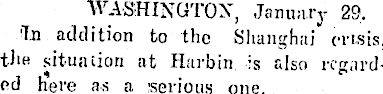 WASHINGTON’, January 29. 'ln addition to the Shanghai crisis, the situation at Harbin is also regarded here as a serious one.