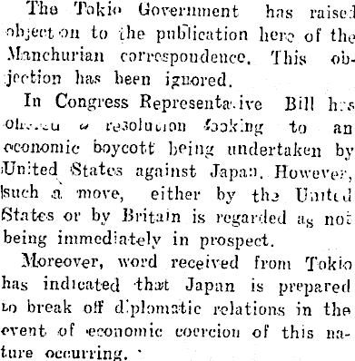 The To kin Government has raised object on to the publication her,? of the Manchurian correspondence. This objection has been ignored. In Congress Representative Bill h.s ‘Olxv ~/u u resolution looking to an economic boycott being undertaken by United ‘States against Japan. However, Is it eh a move, either by the United States or by Britain is regarded a s not being immediately in prospect. Moreover, word received from Toki-o has indicated that Japan is prepared m break off diplomatic relations in the event, of 'economic coercion of this nature occurring. 1