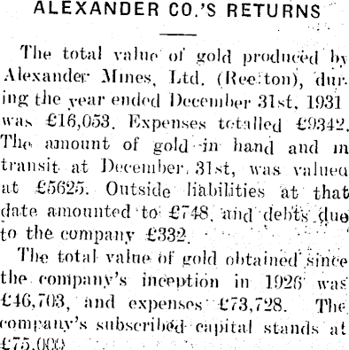 ALEXANDER CO.’S RETURNS r !lie total valueOf gold produced In Alexander Mines, Ltd. (Reoitou), dm--mg tile year ended December 31st. 193] was €16,053. Expenses totalled €9342. The amount of gold in hand and in transit at December. 31st, was valued at £5625. Outside liabilities at that date amounted to £748. and debts glue to the company £332. • I he total value fil gold obtained since the company’s inception in 1926 was" £46,703, and expenses' £73,728. The compauv’s subscribed capital stands at £75,009.