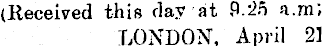 (Received this day at 9.25 a.m", LONDON, April 21
