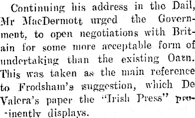 Continuing his address in the Dail, Mr MacDermott urged the Government, to open negotiations with Britain for some more acceptable form of undertaking than the existing Oatn. This was taken as the main reference to Frodshain’g suggestion, which De Valera’s paper the “Irish Press” fm»'inently displays.
