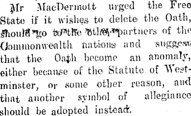 Mr MacDermott urged the Free State if it wishes to delete the Oath, IfiouWfeo tcUtfe m]ft?r*partners of tire 00-mmonwealth trattoria and sviggesi, that the Oath become an anomaly, either because of the Statute of Westminster, or some other reason, and that another symbol of allegiance should be adopted instead.