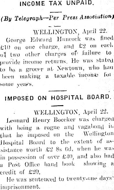 INCOME TAX UNPAID. (By 'Telegraph —Ber Brets Association ; WELLINGTON, April 22. George Edward Hancock was fined gill on one charge, and £2 on each c 4 two other charges of- failure to provide income returns. He was stated to he a grocer at Newtown, who ban been making a taxable inconte foi some yeiijt's. IMPOSED ON HOSPITAL BOARD. WELLINGTON. April 22. Leonard Henry Boecker was charged with being a. rogue and vagabond in that he imposed on the Wellington Hospital Board to the extent of assistance Worth €2 8s (id, when he was in possession of over £4O, and also had a Post Office hand book showing a credit of £2O. He was sentenced to twenty-one days' imprisonment.