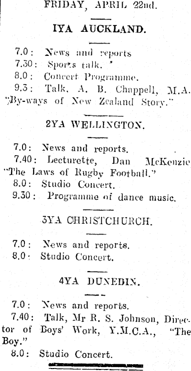 FRIDAY, APRIL 22nd. IYA AUCKLAND. 7.0 ; News and reports 7.30: Spores tnlk. * 8.0 : Concert Programme. 9.3; 'L'alk, A. 13. Chappell, M.A.. "•By-wavs of Now Zealand Story." 2YA WELLINGTON. 7.0: News and reports. 7.40; Lectnrette, Dan McKenzie, "The Laws of Rugby Football.” 8.0: Studio Concert. 9.30 : Programme of dance music. 3YA CHRISTCHURCH. 7.0 : News and reports. 8.0 • Studio Concert. 4YA DUNEDIN. 7.0 : News and reports. 7.40: Talk, Mr R. S. Johnson, Director of Boys’ Work, Y.M.C.A., “The Boy.” 8.0: Studio Concert.