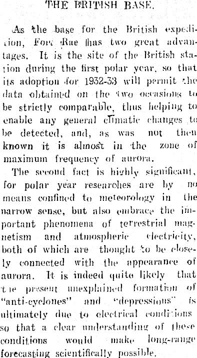 THE BRITISH BASK. iAis the ba.se for the British expedition, Foiv 'Rae |has two t<rc a ii t advantages. It i.s the site of tlie British station during the first polar year, so that its adoption for 1932-33 will permit '.he data obtained on the awo occasion* to be strictly comparable, thus helping to enable any general eTTmatie changes to Ire detected, and, as was not then known it is almost in the zone of maximum frequency of aurora. The second fact is highly significant, for polar year researches are by no means confined to meteorology in tlie narrow sense, but also embrace the important phenomena of terrestrial magnetism and atmospheric electricity, both of which are thought to he closely connected with the appearance ol aurora. It is indeed quite likely that tie present unexplained formation of “nnti-cyeJones" and ‘'depressions" is ultimately due to electrical condi ions so that a clear understanding of these conditions would make long-range forecasting scientifically possible.