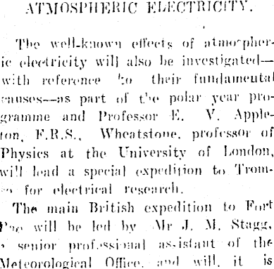 A TAfOSPII EH IC K LKCTR IOI T Y . The well-known effect's of atimrpheric electricity will also lie investigated—with reference ho (heir fundamental eauses—as part of the polar year programme and Professor K. V. Appleton, F.R.S., Wheatstone, professor of Physics at the University of London, will lead a special expedition to 'I rom- •> for electrical research. The main British expedition to Fni'f will he led bv Mr •!. M. Stagg, > senior professional as.islant ol tbfMeleoi’ologieal Office. a”d will, it is