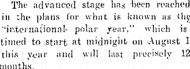 The .advanced stage has been reached in the plans for what is known as the “mternational- polar year,” which is timed to start at midnight on August 1 this year and will last precisely 12 months.