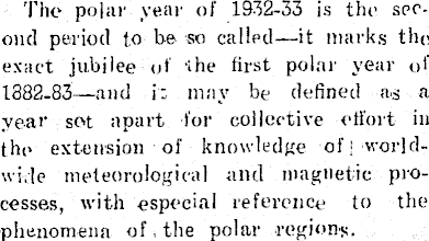 The polar year of 1932-33 is the second period to be so called—it marks the exact jubilee of 'the first polar year of 1382-83—and i: may be defined as a year sot apart for collective effort in the extension of knowledge of i worldwide meteorological and magnetic processes, with especial reference to the phenomena of, the polar regions.