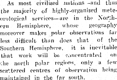As most civilised nations -and thus the majority of highly-organised meteorological services—are in the Northern Hemisphere, whose geography moreover makes polar observations far less difficult than does that oi the Southern Hemisphere, it is inevitable that work •will b* concentrated on •die north polar regions, only a few scattered centres of observation being maintained in the far south.