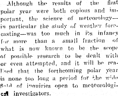 Although the results of the first polar year were both copious and important, the science of meteorology—in particular fhe .study of weather lorecasting—was too much in ids infancy f■ ,r more than a small fraction of what is now known to he the scope of possible research to be dealt with or even attempted, and it will lie reaI'sed that the forthcoming polar year is none too long a period for tlm w'de fi-M of ionuirie.s open to meteorological investigators.