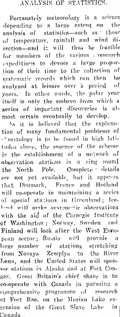 ANALYSIS OF STATISTICS. Fortunately meteorology is a science depending to a large extent on the analysis of statistics—such as ' those of temperature, rainfall and wind direction —and it will thus be feasible for members of the various • research expeditions to devote a large proportion of their time to the collection of systematic records which can then be analysed at leisure over a period of years. In other words, the polar year itself is only the embryo from which a ■series of important discoveries is almost certain eventually to develop. Vs it is believed that the explanation of many fundamental problems of - ' ontology is to he found in high latitudes alone, the essence of the scheme is the establishment of a network of observation stations in a ring round the North Pole. Complete ' details are not yet available, but it appears that Denmark, France and Holland will co-operate in maintaining a series of .special stations in Greenland ; Ice--1 ”>d will m ! d<° .svstom ■■■'ic observations with the aid of the Carnegie Institute of Washington ; Norway, Sweden and Finland will look after the West Euro-! pe-an sector; Russia will provide a 1 large- number of stations stretching | from Novaya Zemplya to the River | Lena, and the United States will sponsor stations in Alaska and at Fort Conger. Great Britain's chief share is to co-operate with Canada in pursuing a comprehensive programme of research at Fort Rae, on the Marian Lake extension of the Great Slave Lake in j Canada.