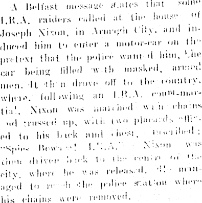 A Belfast message a ales that sum" I.!’.A. raiders called at the holts" .Joseph Ni 'am, in Armagh City, and indue,.d him C> euier a motor-ear on th" pretest that tin- !>‘dicc want d him, Che car being filled wth masked, armed wilde. foil iwing an IP. A. mim-in.ie-t i i l . Nixon was iiaiiiiiud »m eha'iis ~| * i'll sst. (• up. wilil IV," pfiieards ■‘lie - 0,1 to his luck and dicsi, I '' - rl |l " ' 1 ; "5,.;,.- Dew . !.’•••'■• A Ami was ciieii di ivee bmk ! ■ !a - ' , 1 citv, when he was releas.d. C managed to re ■!, all" poliee Smi. -m wli.o|,is chains wen- removed.