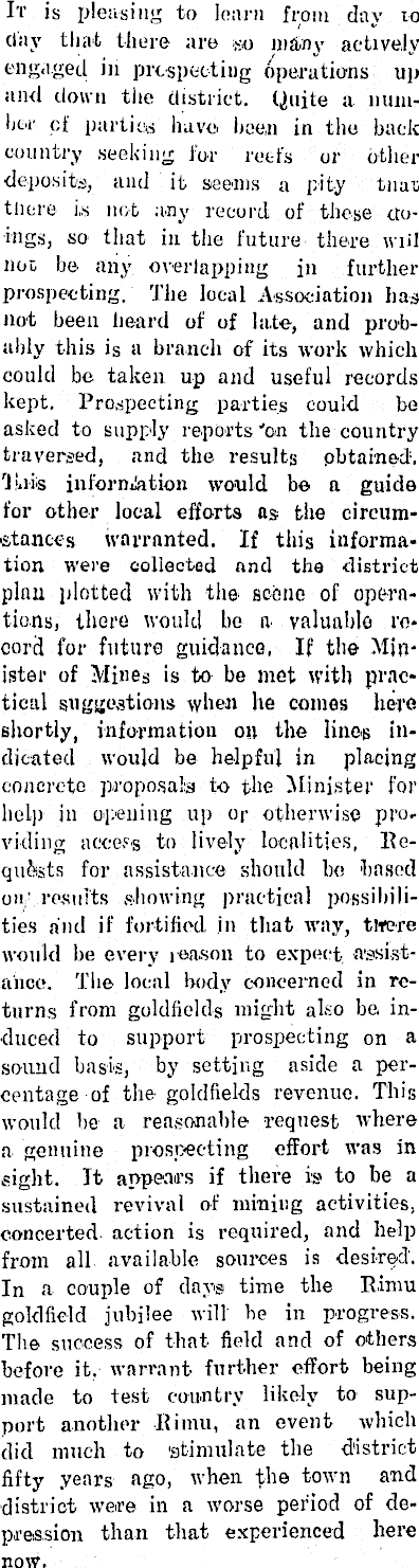 It is pleasing to learn from day to day that there are so many actively engaged in prospecting operations up and down the district. Quite a number cf parties have', been in the back country seeking ior reefs or other deposits, and it seems a pity tnat there is not any record of these doings, so that in the future there will not be any overlapping in further prospecting. The local Association has not been heard of of late, and probably this is a branch of its work which could be taken up and useful records kept. Prospecting parties could be asked to supply reports 'on the country traversed, and the results obtained. 'Hits information would be a guide for other local efforts as the circumstances warranted. If this information were collected and the district plan plotted with the scene of operations, there would he a valuable record for future guidance, If the Minister of Mines is to be met with practical suggestions when he comes here shortly, information on the lines indicated would be helpful in placing concrete proposals to the Minister for help in opening up or otherwise providing access to lively localities, Requests for assistance should be based on; results showing practical possibilities and if fortified in that way, tlfere would lie every reason to expect assistance, The local body concerned in returns from goldfields might also be induced to support prospecting on a sound basis, by setting aside a percentage of the goldfields revenue. This would be a reasonable request where a genuine prospecting effort was in sight. It appears if there is to be a sustained revival of mining activities, concerted action is required, and help from all available sources is desired. In a couple of days time the Rimu goldfield jubilee will be in progress. The success of that field and of others before it, warrant further effort being made to test country likely to support another Rimu, an event which did much to 'stimulate the district fifty years ago, when the town and district were in a worse period of depression than that experienced here now.