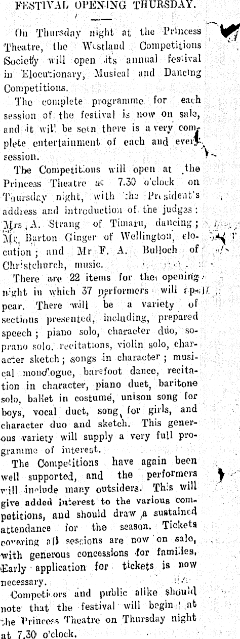 FESTIVAL OPENING THURSDAY. Oil Thursday night at the Princess :w Theatre, the Westland Competitions Society will open -its annual festival in Elocutionary, Musical and Dancing Competitions. The complete programme for each session of the festival is now on sale, and it wit', be seen there is a very complete entertainment of each and everjt, session. ■• The Competitions will open at .the Princess Theatre at 7.30 o clock on Thursday night, with :Iki Pn,sklent's address and introduction of the judges : M/s,A. -Strang of Timaru, dancing; Mr, Barton Ginger of Wellington, do- V cation ; and Mr F. A. Bulloch of ->/ s Christchurch, music. There arc 22 items for then opening -• night in which 37 performers will rp.-d/ pear. There will be a variety of sections presented, including, prepared speech ; piano solo, character cluo, soprano solo, recitations, violin solo, character sketch; -songs in character ; musical mond’.ogue, barefoot dance, recitation in character, piano duet, baritone solo, ballet in costume, unison song for boys, vocal duet, song for girls, and character duo and sketch. This generous variety will supply a very full programme of interest. The Competitions have again been well supported, and the performers . will include many outsiders. This will give added interest to the various competitions, and should draw ~a sustained attendance for the season. Tickets cohering all sessions are now on salo, with generous concessions tor fami.ies, {Early application for tickets is now necessary. Ooinpe-ti l ors and public alike should note that the festival will begin 1 at the Princess Theatre on Thursday night at 7.30 o’clock.