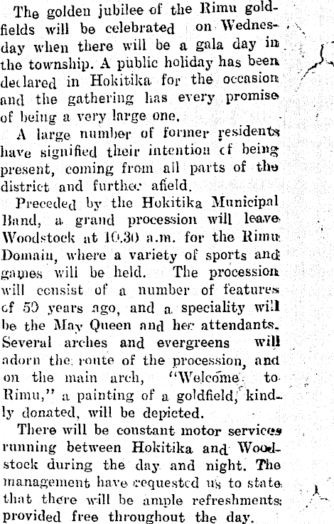 The golden jubilee of the Rimu goldfields will be celebrated 011 ednes- . day when there will be a gala day in > ~ the township. A public holiday has beea declared in Hokitika for the occasion / and the gathering lias every promise of being a very large one. A large number of former residents have signified their intention cf being present, coming from all parts of the district and further afield. Preceded by the Hokitika Municipal Band, a grand procession will leave, Woodstock at 10.30 a.m. for the Rimu: Domain, where a variety of sports and; games will be held. The procession will consist of a number of features of 59 years ago, and a. speciality will be the May Queen and her attendants. Several arches and evergreens will adorn the route of the procession, and on the main arch, “Welcome to Rimu,” a painting of a goldfield, kindly donated, will be depicted. There will be constant- motor service# running between Hokitika and Woodstock during the clay and night. The management have requested u's to state. j that there will be ample refreshments: provided free throughout the day.
