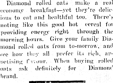 Diamond rolled oats make a real economy breakfast —yet they’re delicious to eat and healthful too. There’s noting like this good hot cereal foi providing energy right through the morning hours. Give your family Diamond rolled oats from to-morrow, and eee how they all prefer its rich, annetising f ivour. When buying rolled oats ask definitely for Diamond brand.