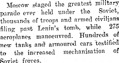 Moscow staged the greatest military parade ever held under the Soviet, thousands of troops and armed civilians filing past Lenin’s tomb, while 275 aeroplanes manoeuvred. Hundreds of new tanks and 1 armoured cars testified to the increased mechanisation of Soviet forces.