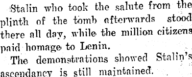 Stalin who took the salute from the plinth of the tomb afterwards stood there all day, while the million citizens paid homage to Lenin. The demonstrations showed Stalin’s ascendancy is still maintained.
