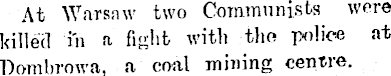 At Warsaw two Communists were killed in a fight with the police at Dombrowa, a coal mining centre.