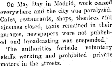 On May Day in Madrid, work ceased everywhere and the city was paralysed. Cafes, restaurants, shops, theatres and cinemas closed,, taxis remained in their garages, newspapers were not published and broadcasting was suspended. The authorities forbade voluntary staffs working and prohibited private motors in the streets.