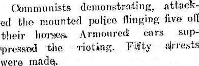 Communists demonstrating, attacked the mounted police, flinging five off tiheir horses. Armoured cars suppressed the rioting. Eiifty a|rrests were madet.